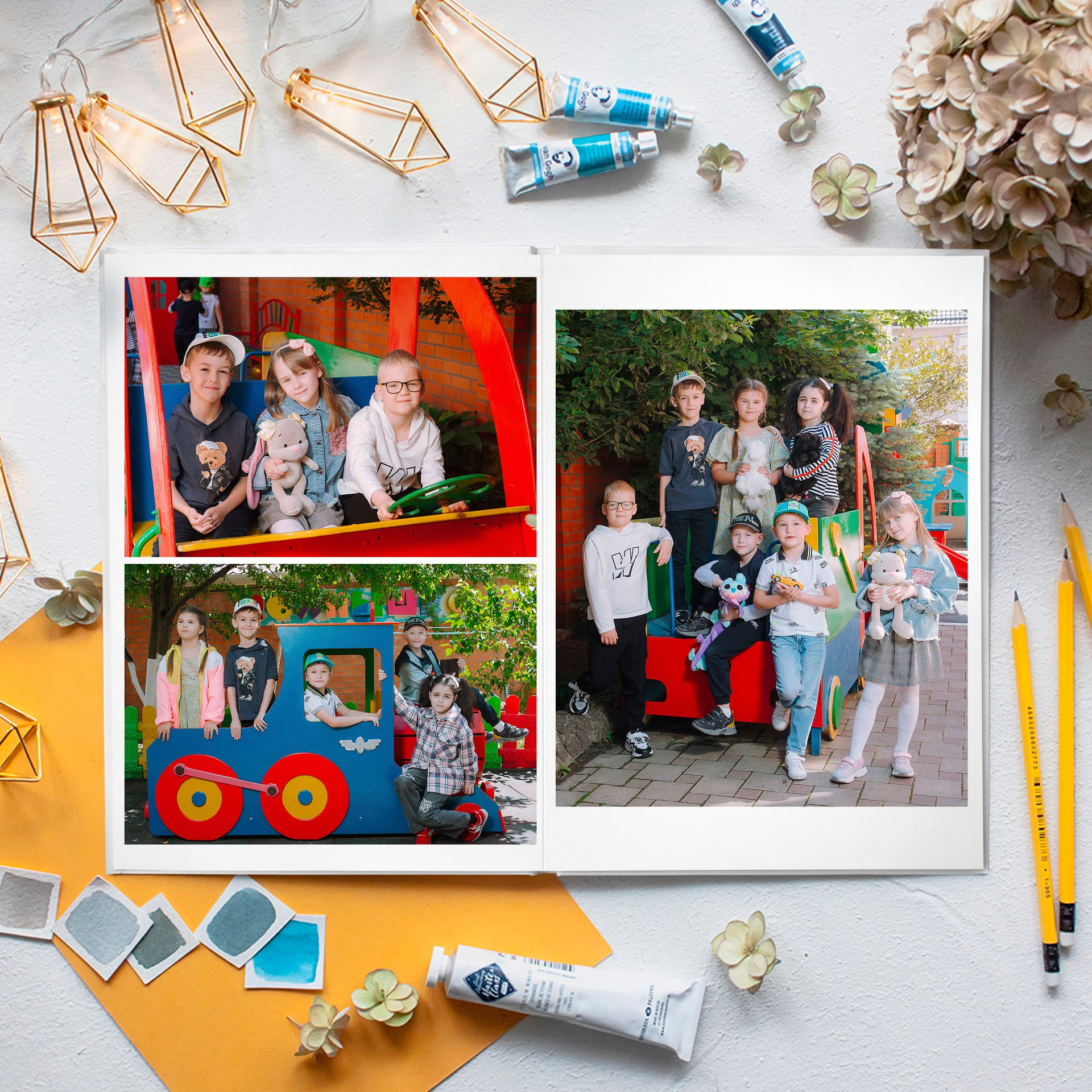 4 разворот: 3 фото (одно вертикальное + два горизонтальных фото на улице в ДС):